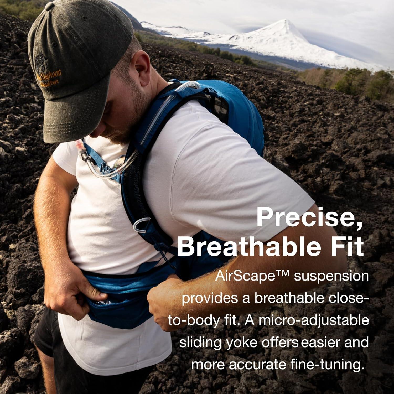 PRECISE & BREATHABLE FIT: Stay cool and supported with an AirScape backpanel that delivers a close-to-body, stable carry and improves airflow to reduce sweat while hiking or cycling. The adjustable sliding yoke and BioStretch hipbelt create a personalized men's fit, keeping the bag stable and comfortable during hikes, bikes, day trips, and other adventures.